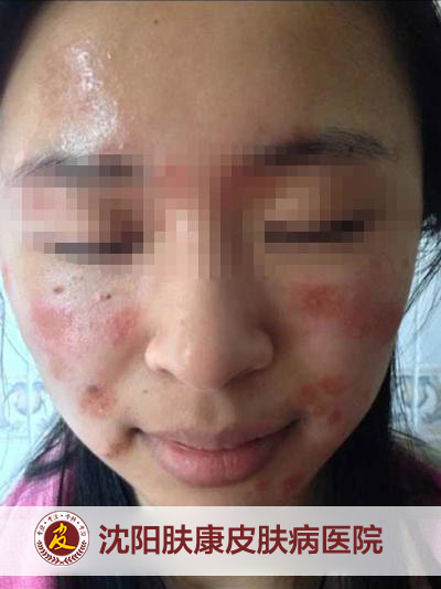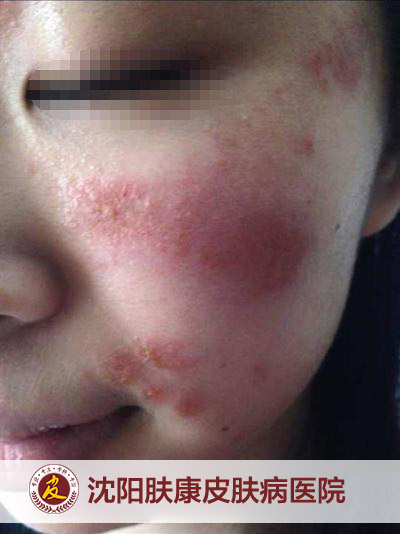 梁绍滢副院长说:“她来的时候,大概是3月2日,面部大块红斑,糜烂,渗出,并有明显瘙痒。皮损是散发性的,散发在额头,面部,而身上没有。”