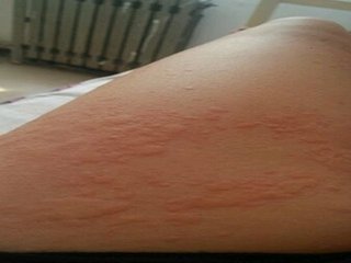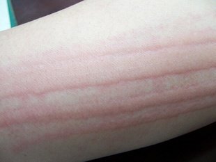 4、人工性荨麻疹:用指甲或钝器划皮肤时,即发生与划痕相一致的条状隆起,不久消退,伴有瘙痒。